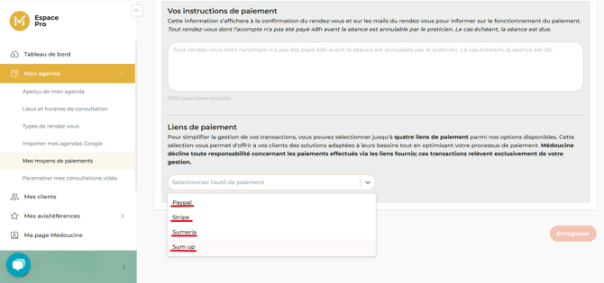 Chez Médoucine, nous avons développé une fonctionnalité vous permettant de transmettre un lien de paiement en ligne (du type Paypal, Stripe, Sumeria, Sum up) à votre clientèle. Ce lien de paiement leur sera transmis à la suite de la validation du rendez-vous, soit dans les emails de confirmation de rendez-vous qu'ils reçoivent.