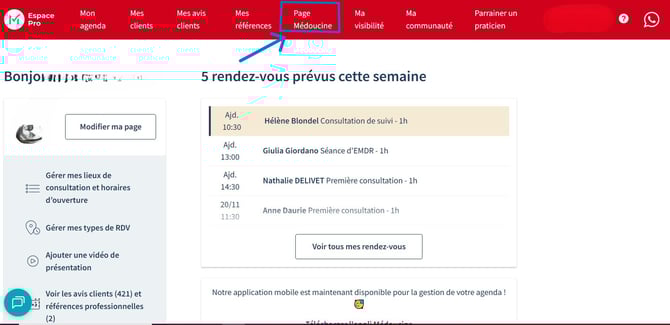 - Depuis votre espace professionnel, dans la barre de menu (vert) en haut, vous cliquez sur "Page Médoucine"