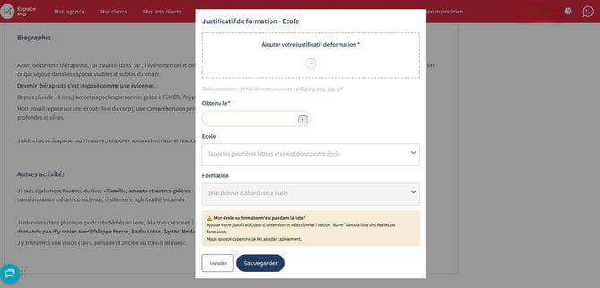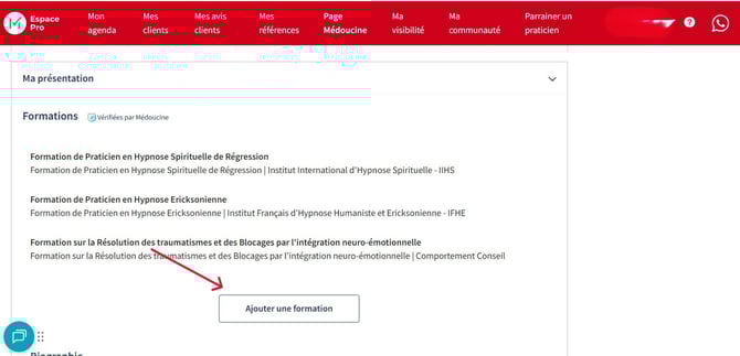 Pour vos formations annexes que Médoucine ne référence pas la pratique (Ex: magnétisme, radiesthésie, Access Bars, LaHoChi etc... ) nous les ajouterons dans une rubrique dédiée qui apparaîtra directement sur votre profil en ligne (la page publique), juste en dessous de vos formations.
